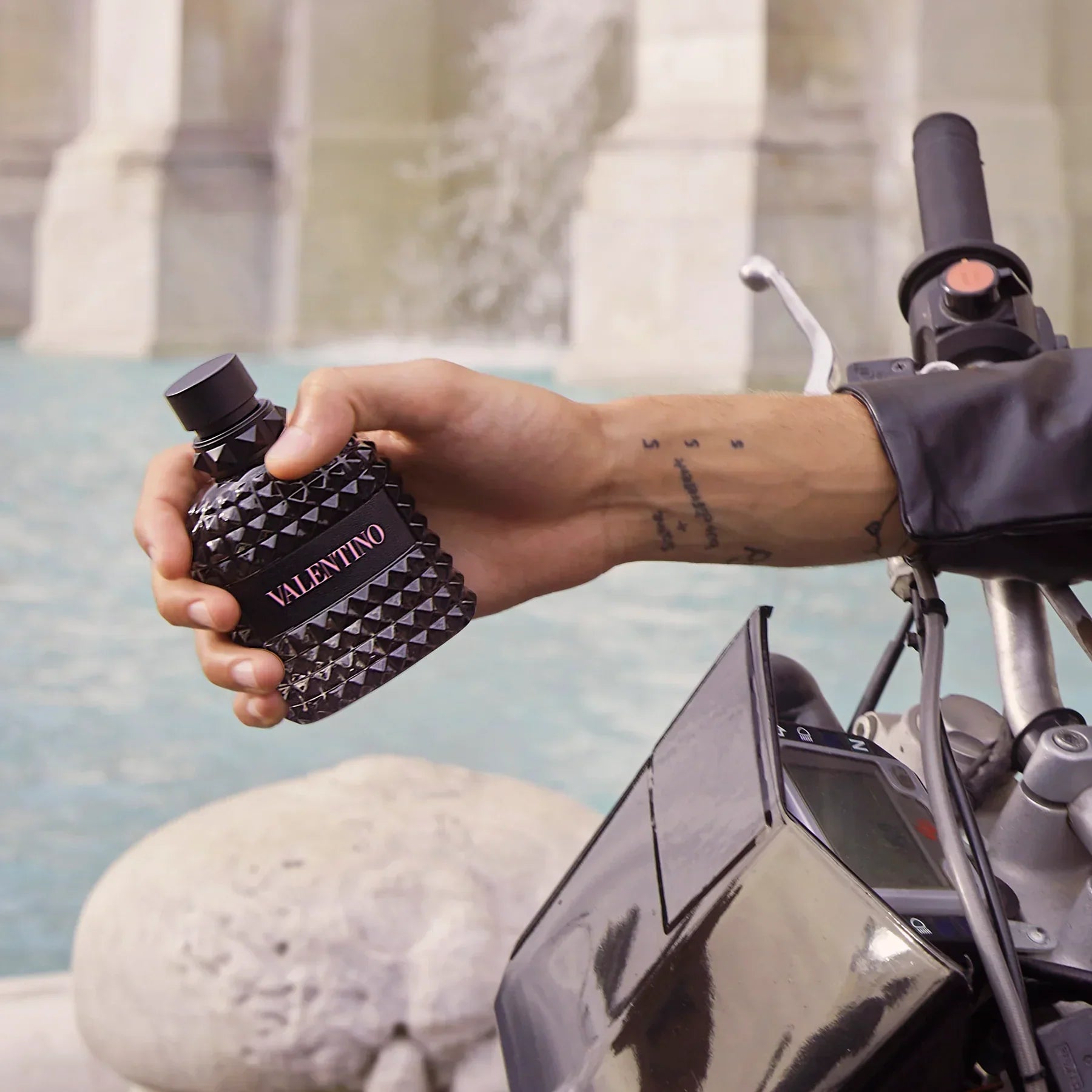 Le flacon reprend l'iconique clou Valentino : inspirée de l'architecture romaine, cette forme pyramidale donne au flacon son côté moderne. Born in Roma est né d'un dialogue avec la ville natale de la Maison Valentino : Rome. Les rues romaines sont remplies de souvenirs hérités du passé. C'est une ville symbole de la liberté de pensée, une ville où culture et esthétique ne font qu'un. Une ville où cohabitent sagesse et audace.