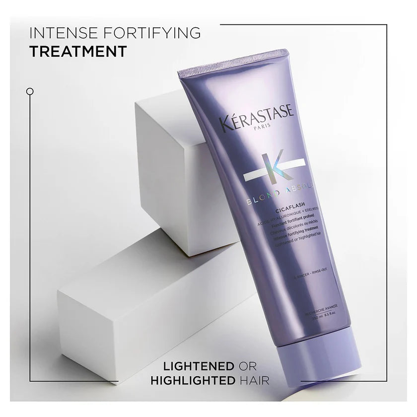 Blond Absolu Cicaplasme Hair Primer 150ml: A lavender-coloured fortifying leave-in for lightened or highlighted hair with heat protection to deeply nourish and add extra softness. Our most complete & intense leave-in for stronger hair.